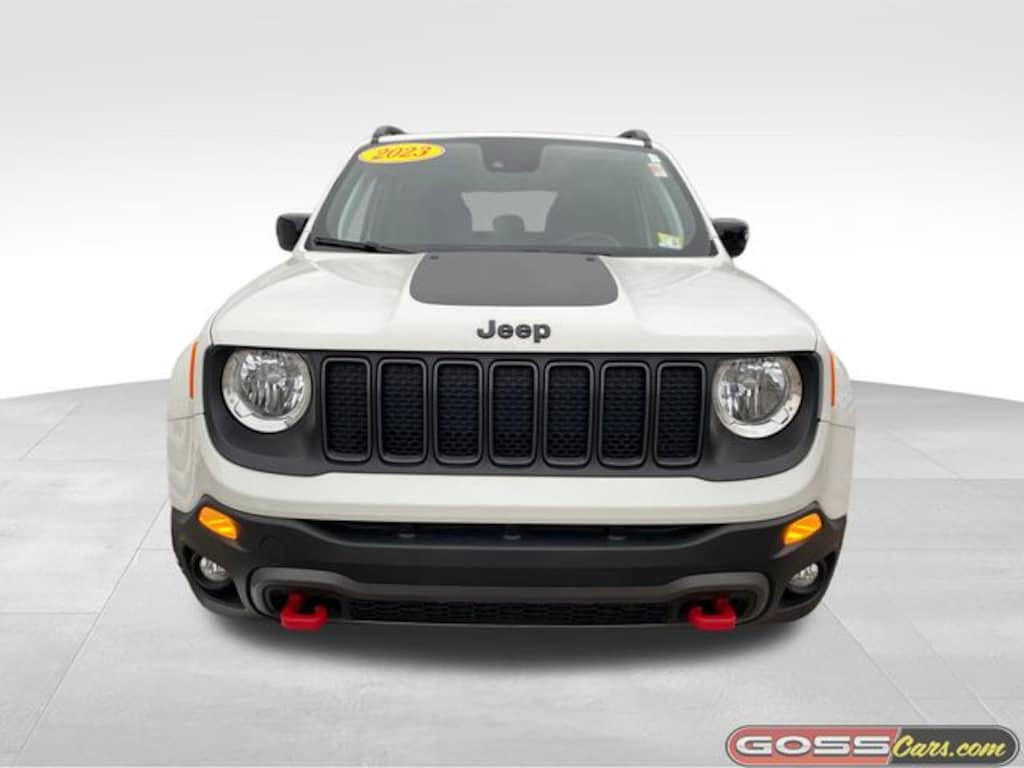 2023 Jeep Renegade Trailhawk, 4WD, 9-Speed 948TE Automatic, 1.3L I4, Alpine White Clearcoat, Chrysler CPOV 7 Year/100,000 Mile Warranty, ONE OWNER, CLEAN CARFAX, NAVIGATION, BLIND SPOT DETECTION, ABS brakes, AM/FM radio: SiriusXM, Apple CarPlay/Android Auto, Electronic Stability Control, Front dual zone A/C, Heated door mirrors, Navigation System, ParkView Rear Back-Up Camera, Power windows, Premium Cloth Low-Back Bucket Seats, Radio: Uconnect 4C Nav w/8.4" Display, Remote keyless entry, Roof rack: rails only, Speed control, Steering wheel mounted audio controls, Variably intermittent wipers, Wheels: 17" x 7" Glossy Black Diamond Cut.
