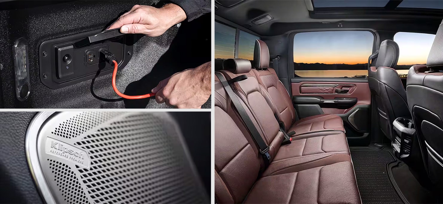 Access the bed easily with the Ramcharger's electric tailgate. Built to open and close on command, use the key fob or tailgate handle to open. Onboard power options are featured in the truck bed, making it possible to charger power tools, personal tech, and more. Enjoy hands-free driving assist and one pedal driving mode for added peace of mind. Plus, be entertained with the available 23-speaker Klipsch® Reference Premiere Audio System - the most powerful available audio system in its class.
