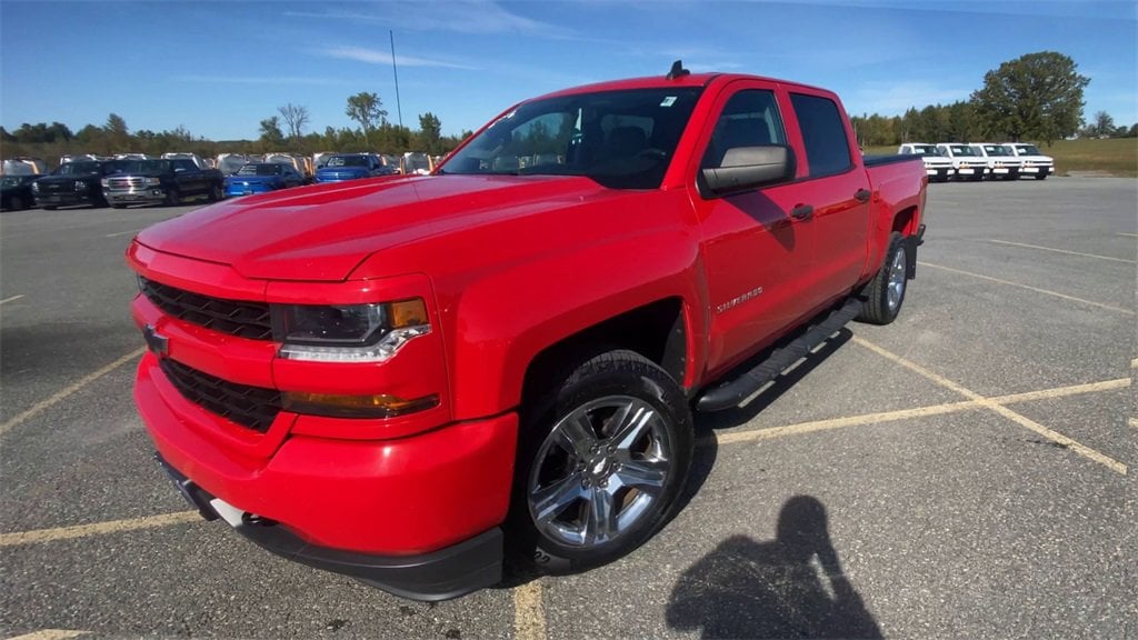2018 Chevrolet Silverado 1500 Custom Crew Cab, 4WD, 6-Speed Automatic Electronic with Overdrive, EcoTec3 5.3L V8, Red Hot, CLEAN CARFAX, Dark Ash With Jet Black Interior Accents Cloth, ABS brakes, Air Conditioning, Alloy wheels, Bed Liner, Black Power Adjustable Heated Outside Mirrors, Bluetooth® For Phone, Body Color Rear Bumper w/Cornersteps, Body-Color Grille Surround, Body-Color Headlamp Bezels, Chevrolet w/4G LTE, Custom Convenience Package, Driver Information Center, Electric Rear-Window Defogger, Electronic Stability Control, Exterior Parking Camera Rear, Front Body-Color Bumper, Front Frame-Mounted Black Recovery Hooks, Heavy Duty Suspension, Heavy-Duty Rear Locking Differential, High-Intensity Discharge Headlights, OnStar & Chevrolet Connected Services Capable, Power Windows w/Driver Express Up, Preferred Equipment Group 1CX, Radio: AM/FM w/7 Diagonal Color Touch Screen, Rear 60/40 Folding Bench Seat (Folds Up), Remote Keyless Entry, Silverado Custom Trim, SiriusXM Satellite Radio, Speed control, Trailering Package. Clean CARFAX.